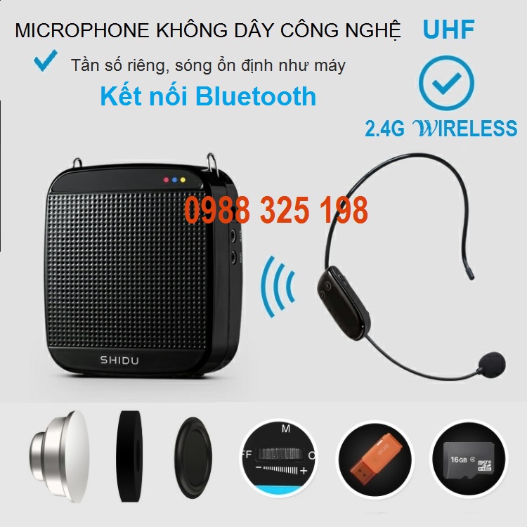 Phụkiện gồm: 01Micro cài đầu không dây, Xạc pin, dây đeo…